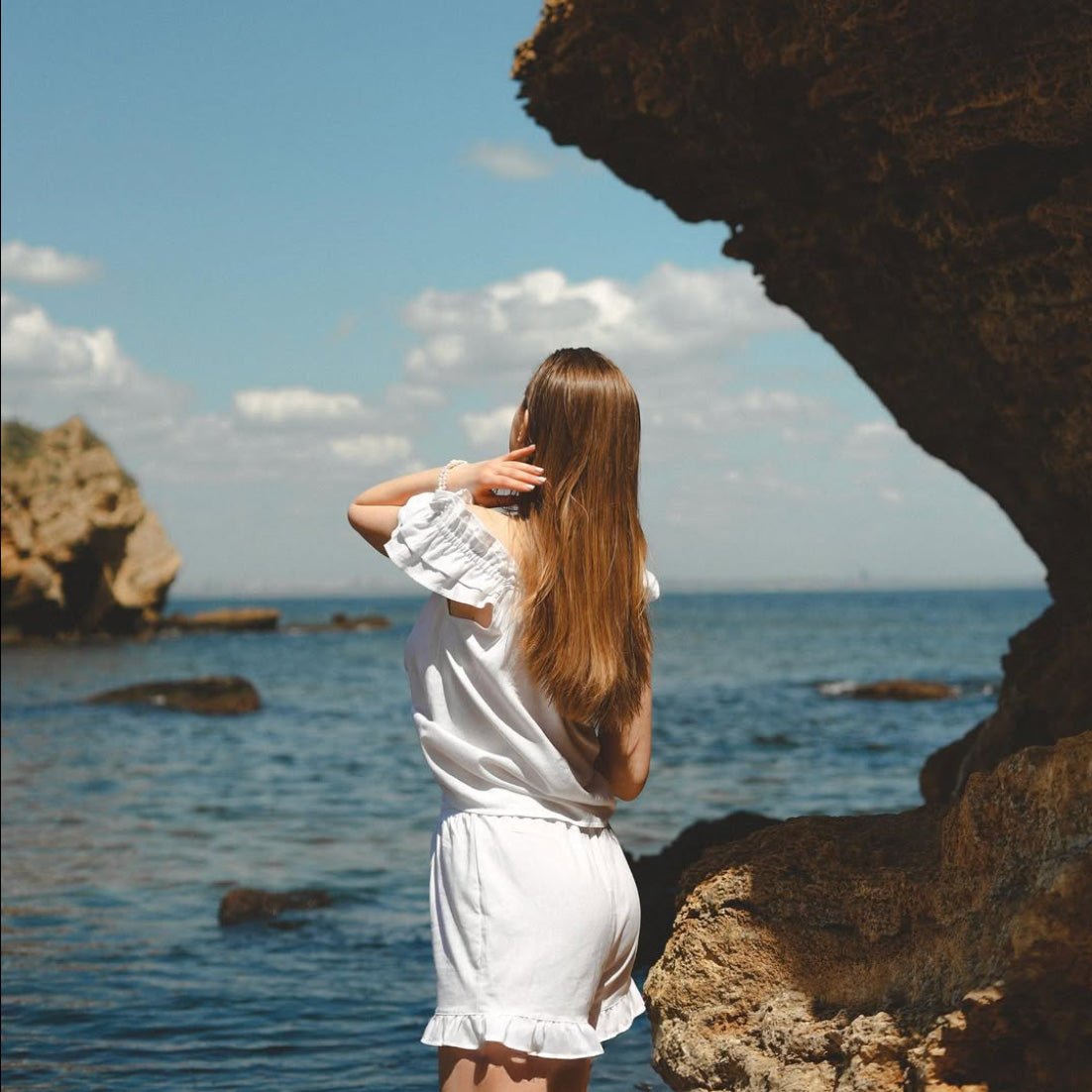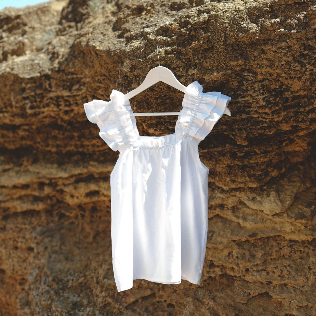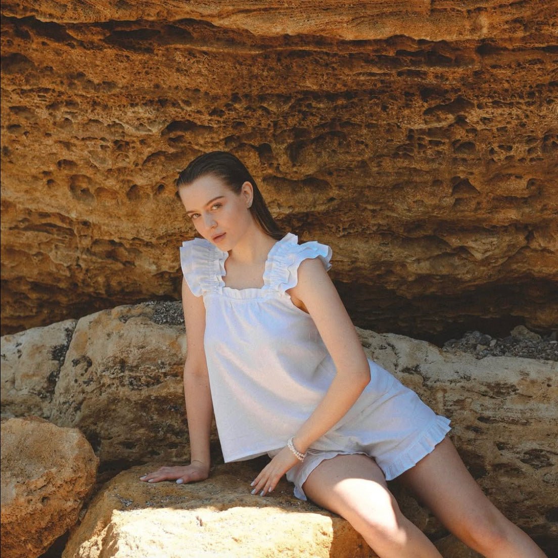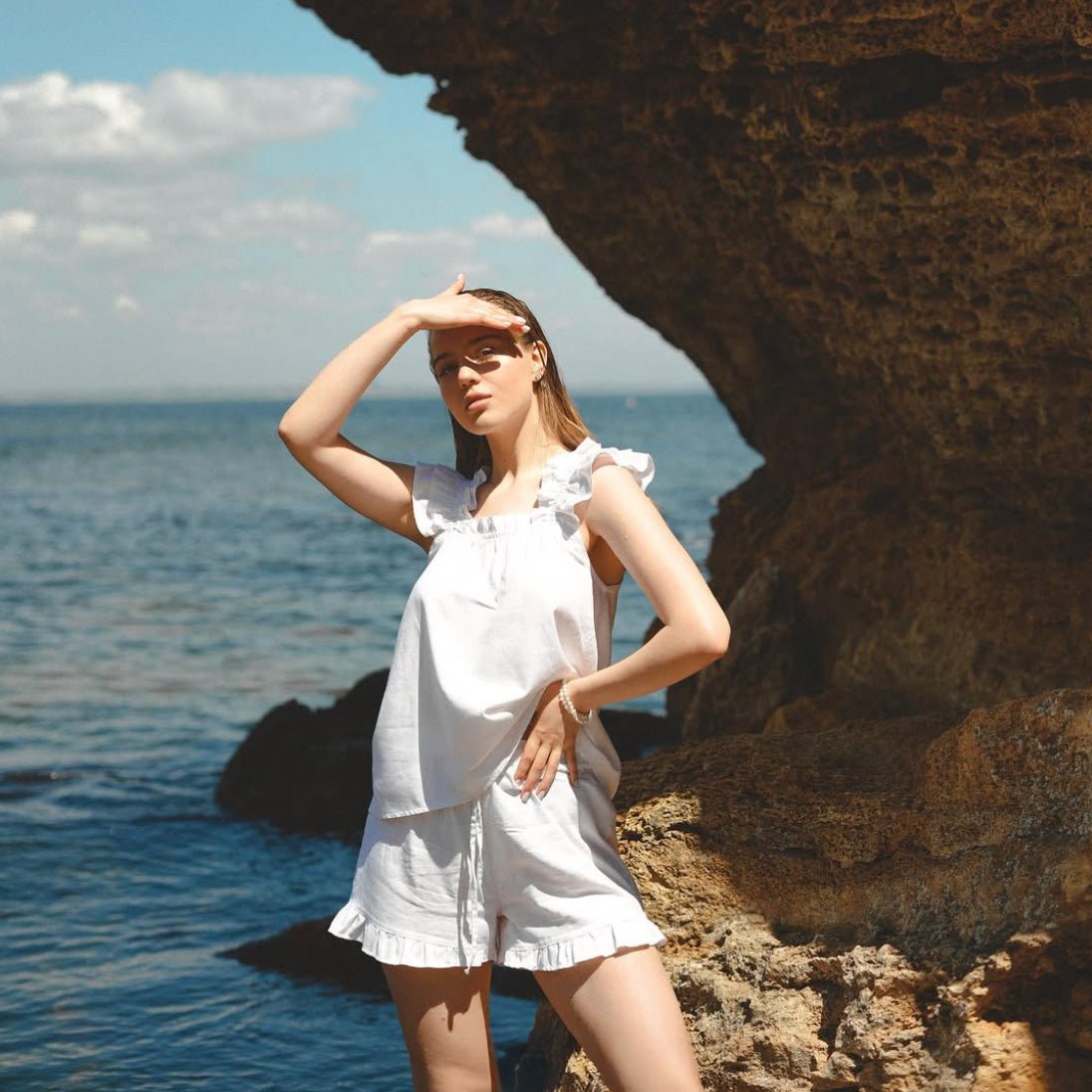 Crafted from recycled polyester, it’s ultra-soft, lightweight, and breathable, keeping you comfortable no matter where the day takes you. The relaxed silhouette, delicate ruffle details, and airy fabric make it perfect for both unwinding at home and strolling along the coast.