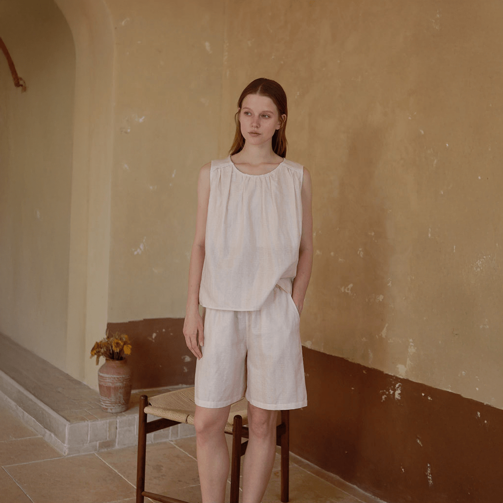 Crafted from 100% Organic Cotton, the Willow Whisper Pajama Set invites you into a world of pure softness — like an early breeze gliding through sun-washed walls. With a sleeveless gathered top, delicate lace trim, and a subtle textured weave, this set brings a touch of quiet charm to your slowest, most restful hours.