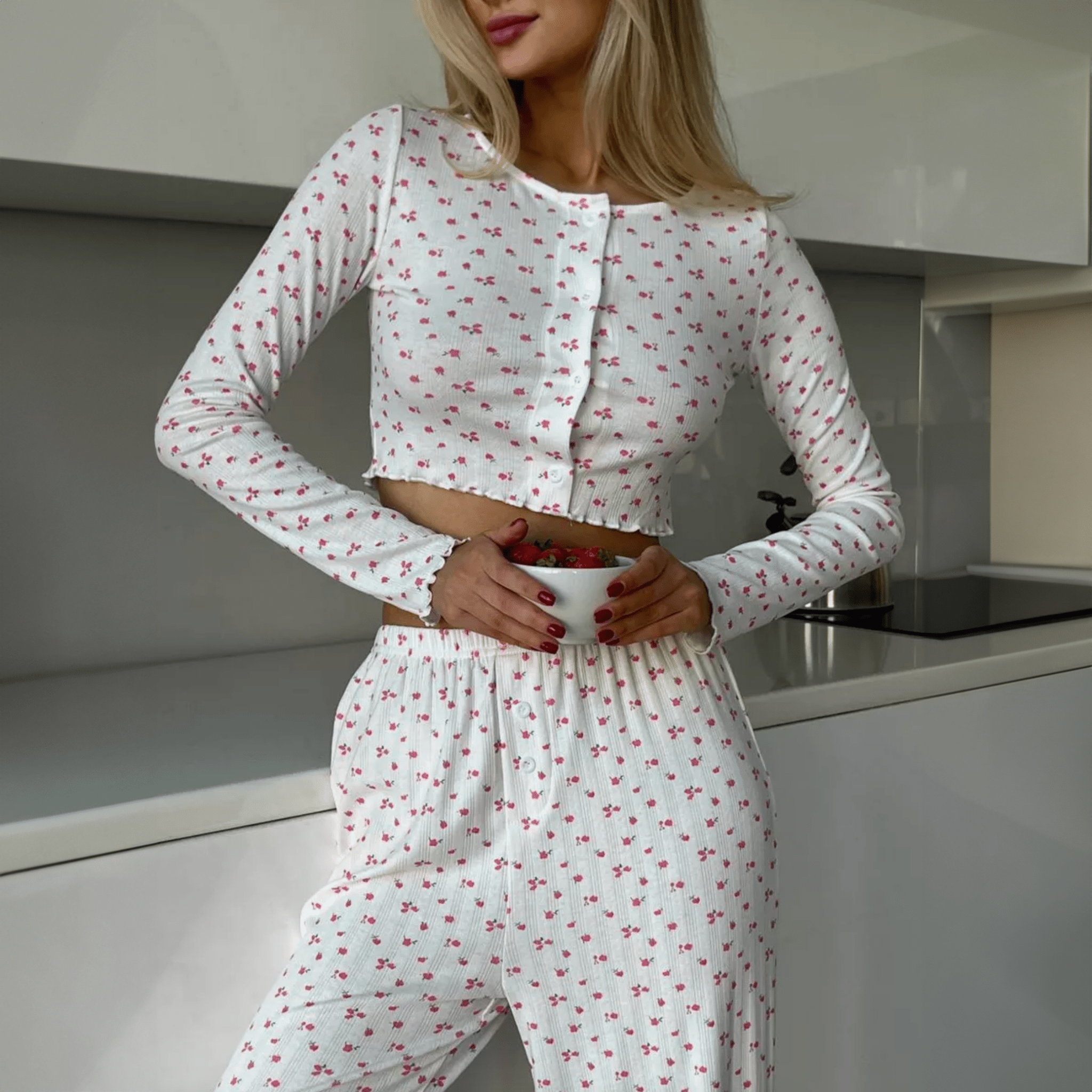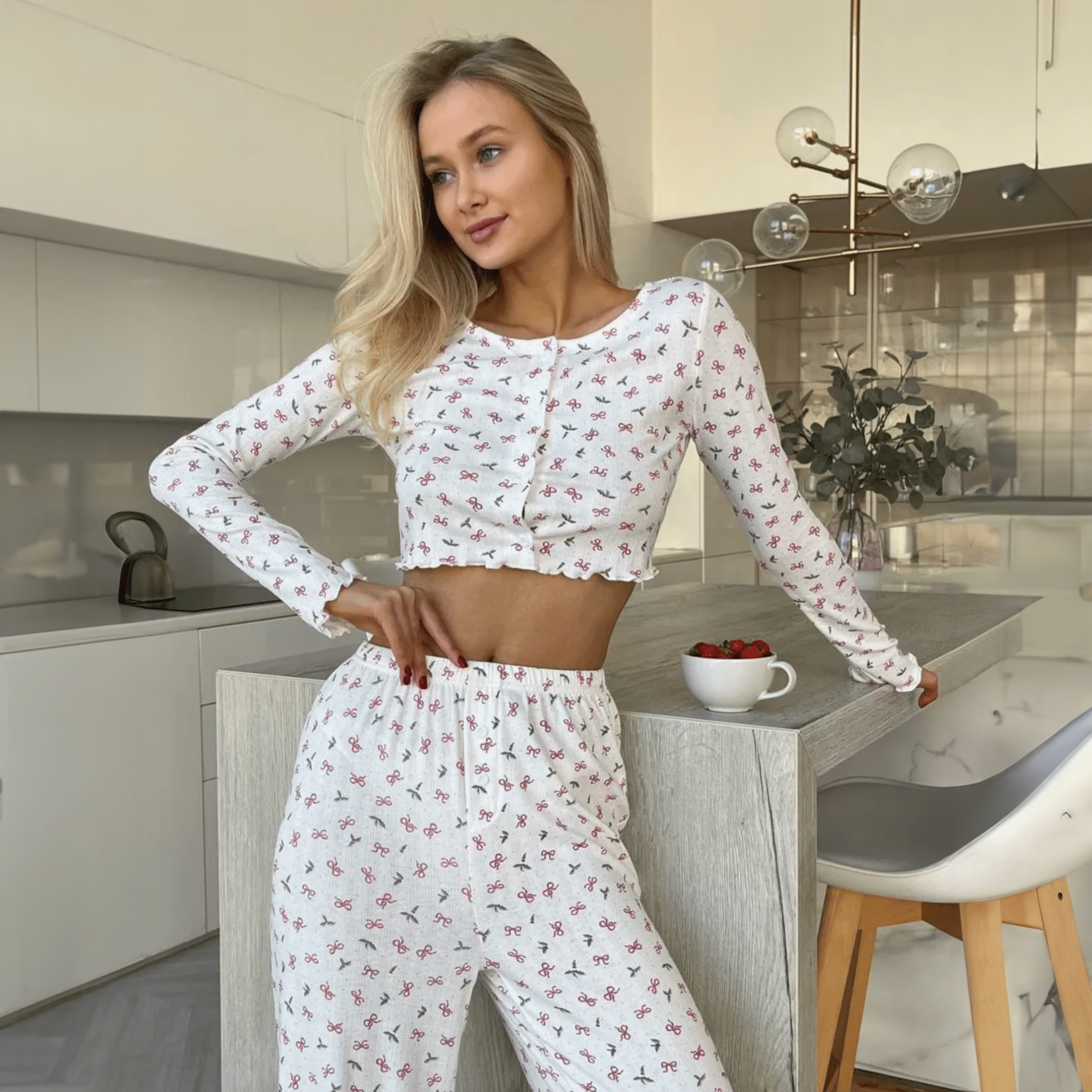 Unwind in style with the Dreamy Two-Piece Pajama Set, designed for peaceful nights and effortless mornings. Crafted from a soft, breathable blend of 29% Vsicose, 63% Recycle Polyester and 8% Elastane, this set feels light and cozy while keeping its shape for lasting comfort. Choose between two charming prints – delicate bows for a sweet, feminine touch or dainty florals for an elegant, timeless look. The cropped button-up top and elastic-waist pants create a relaxed yet flattering fit, perfect for lounging or drifting off to dreamland.